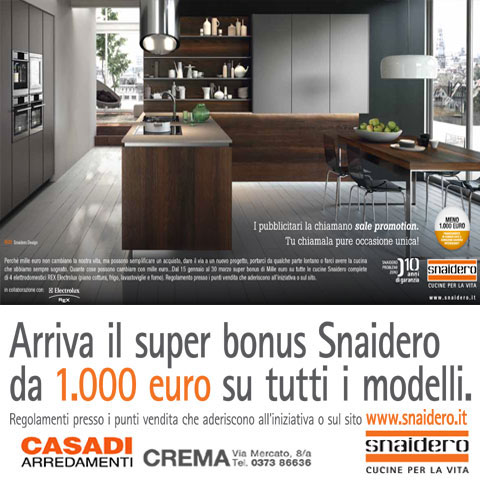 Dal 1S + 20 mesi tasso zero su tutte le cucine SNAIDERO complete di 4 elettrodomestici Rex. Questa ed altre promozioni da CASADI!! ...PASSA PAROLA
